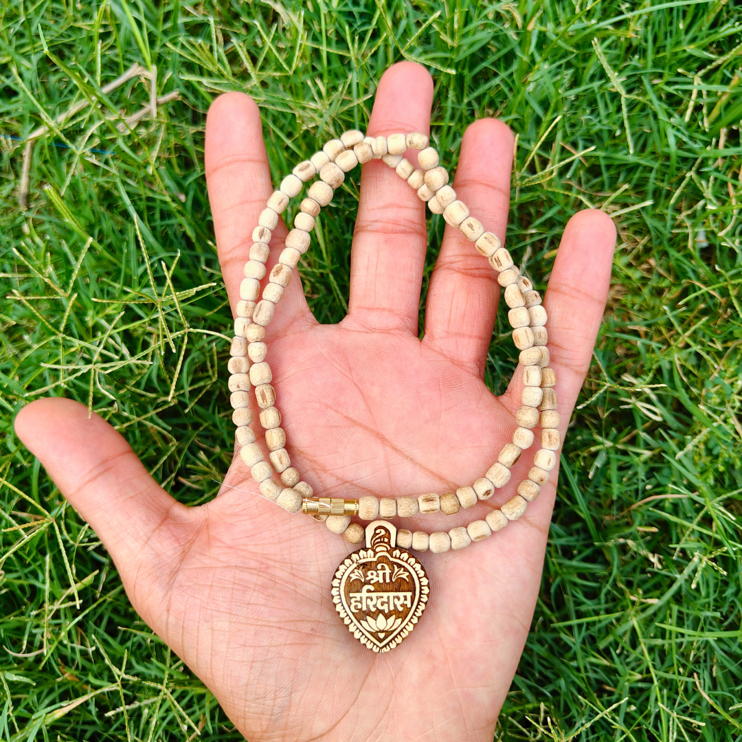 The Shri Haridas Naam Locket Tulsi Mala is a sacred spiritual accessory crafted for devotion and inner peace. This holy mala is made from authentic Tulsi (Holy Basil) beads, revered in Hindu tradition for their purifying and protective qualities. The centerpiece features a beautifully inscribed “Shri Haridas” naam locket, symbolizing divine love, surrender, and devotion.